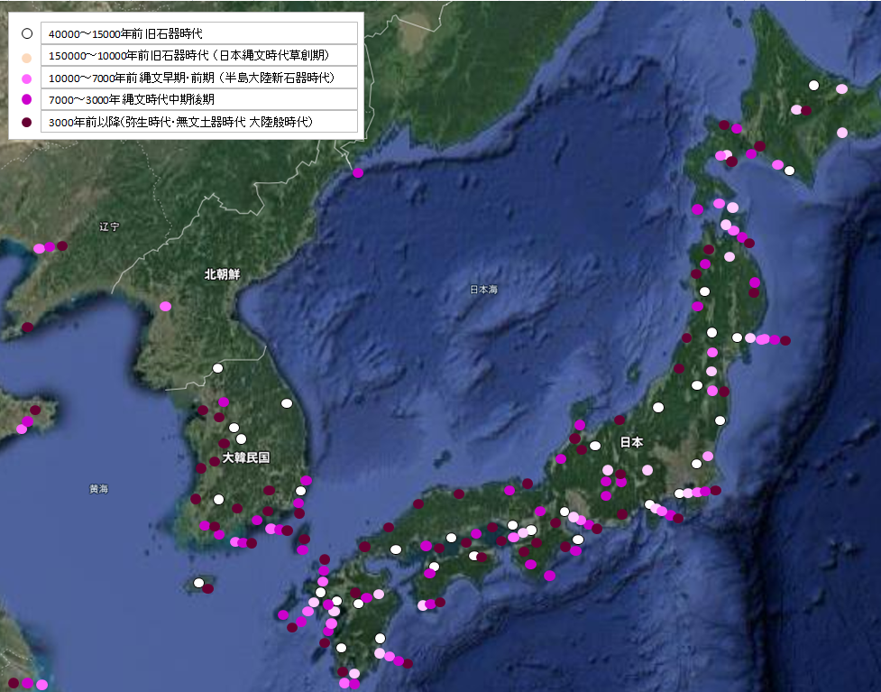 時代区分(縄文前期・弥生後期・新石器時代中期・続縄文後期などの表示)
